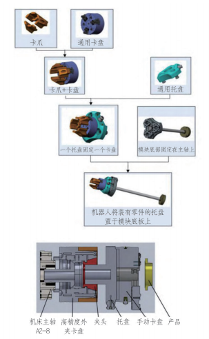 常见的自动化制造单元通常用于批量产品的生产制造,由于其产品种类少、单一产品数量多,一般使用专用工装进行零件的装夹和定位。受限于车间回转类零件多,品种少,批量小的特点,采用专用工装的方案成本高、柔性差,与单元建设初衷相违背。经市场调研比对,此次单元建设拟选取以高精度定位系统为基础的装夹方案。