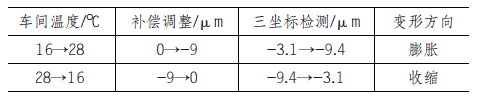 由上述结果可知,车间温度变化带来的补偿调整可分为三个阶段 :16~21℃为第一个区间,轴套孔尺寸加工调整补偿值与三坐标恒温检测标准值相比表现为 “缩” 的趋势,均值为5~6μm;21~23℃为第二区间,轴套孔尺寸加工调整补偿值与三坐标恒温检测标准值相比表现为 “持平” 的趋势 ;23~28℃为第三区间,轴套孔尺寸加工调整补偿值与三坐标恒温检测标准值相比表现为 “涨” 的趋势,均值为 4~5μm。