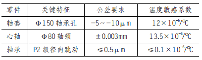且表面粗糙度同样要求严苛,Ra 值一般要求达到 0.4~0.8μm,保证夹具装夹的紧密性与稳定性,防止加工过程中夹具松动或偏摆 ; 心轴上与轴承配合的轴肩,其端面圆跳动公差通常限定在±0.002~±0.004mm,保证轴承安装的垂直度,避免因轴肩偏摆导致轴承受力不均,进而引发主轴轴线偏移 ; 轴套的外圆柱面,其圆柱度公差约为 ±0.003~±0.006mm,直线度公差在全长范围内控制在 ±0.005~±0.01mm,保障主轴整体外形精度,确保与箱体等部件的装配精度。整理后如表 1 所示。