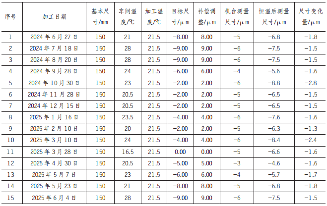 针对上述车间温度变化,需要适时调整加工目标值,保证最终加工目标值进入公差范围,本研究所加工轴套 φ150 轴承孔,要求公差范围 -5~-10μm 以保证轴承装配精度。全年对应车间温度变化的调整量为 -9~0μm,最小值 -9μm 发生在 5~6 月,车间最高温度在26~28℃时,在当天的加工过程中,早上设