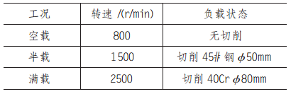 数控机床主轴振动信号采集数据为故障分析的重要基础,为了使数据更加全面有效,现对不同转速与负载状态的全覆盖工况进行数据采集,信号采集工况,见表 2。