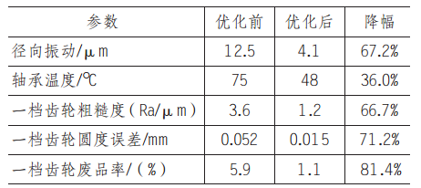 由表 4 可知,通过实施 “轴承预紧调整 + 混合轴承升级 + 精准动平衡优化 + 润滑强化” 的综合方案,高效、经济地解决了主轴振动温升顽疾,显著提升了变速器一档齿轮的加工质量和生产效率,投资回报率高。方案具有普适性。