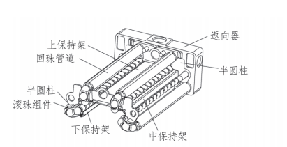 滚动直线导轨副内部结构如图 2 所示,回珠路径由直线段及曲线段组成,直线段主要由回珠管道、上保持架、下保持架及中保持架形成,曲线段主要由返向器及半圆柱形成,直线段与曲线段由以上各零件组装拼接形成完整的回珠路径。采用拼接的方式,可以避免滑块主体长度的影响,同时标准长度与加长长度的滑块主体可以共用相同的返向器及半圆柱,减少了模具成本。另外采用拼接的方式,使零件的结构简化,同样可以降低模具成本,延长模具使用寿命,最终降低导轨副的成本。