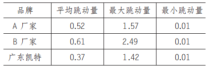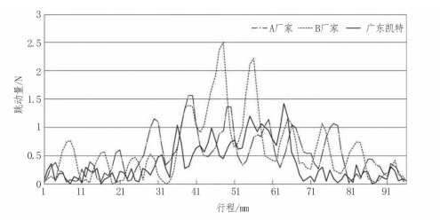 测试对象分别采用本文介绍的广东凯特、A厂家及 B 厂家的 25 规格导轨副,在相同的测试条件下,对比导轨副运行的摩擦力。由表 1 摩擦力跳动量对比数据及图 7 摩擦力跳动量曲线图可知,广东凯特导轨副的摩擦力跳动量整体上较测试的 A 厂家及 B 厂家低,说明本文所介绍的带保持链结构可有效提升导轨副的运行顺畅度。通过测试对比验证,本文介绍的滚动直线导轨副结构设计合理,在国际同等规格导轨副性能上有优势。