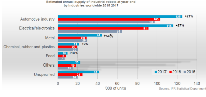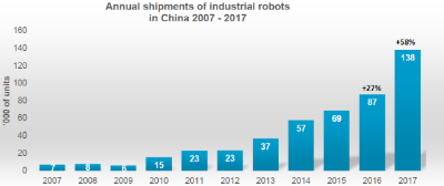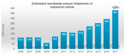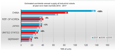 工业机器人市场急剧扩张的原因主要是受中国的影响,中国2017年全年对比需求量增加58%,美国和德国分别增加6%和8%。