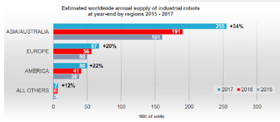 根据地域别销售来看的话亚洲地区增长最强势。中国去年销售了13万8000台工业用机器人,韩国4万台,日本3万8千台。美国和德国各销售3万3千台和2万2千台。