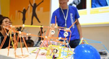 一款机器人益智玩具在机器人大会上展示(8月15日摄)。8月15日,2018世界机器人大会在北京亦创国际会展中心开幕。大会由论坛、博览会、大赛、地面无人系统活动四大板块组成,来自16个国家和地区的选手将参加机器人大赛。新华社记者 张晨霖 摄