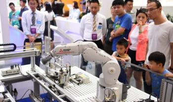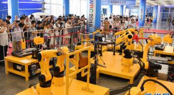8月15日,观众在机器人大会上参观一款工业机器人。当日,2018世界机器人大会在北京亦创国际会展中心开幕。大会由论坛、博览会、大赛、地面无人系统活动四大板块组成,来自16个国家和地区的选手将参加机器人大赛。新华社记者 张晨霖