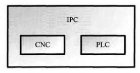 该方案中,CNC、PLC 的功能均在 PC 机上,以软件控制方式实现,PC 机具有超强的逻辑运算能力,利用扩展的总线接口,可与外部的驱动单元相连接。软件型控制系统为实时操作系统,能够对 CPU 资源自主使用,借助 Windows 操作系统,可完成画面显示、数据通信、逻辑扫描、控制任务等。该系统突出的特点是运算功能强大,现场总线技术的运用,丰富了控制系统对外围输入及输出信号的监控。