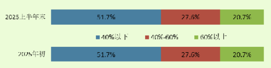 资产负债率较年初增长的有30家,占比51.7%。资产负债率超过70%的,年初有8家,上半年末降至6家。期末资产负债率的最高值为91.2%,无超过100%的情况。资产负债率分布情况见图1。