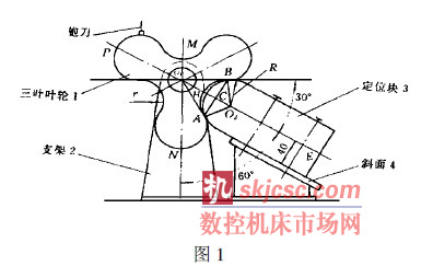 如图1 所示, 设三叶叶轮的非工作面半径r = 35mm, 制作定位块3 要求圆柱头部半径R = 40mm( R> 1. 1r ) , 定位块长250mm, 宽60mm, 高H = 2R = 80mm, 安装在通过叶轮轴心、与水平成30°夹角的平面平行且距离为40mm 的斜面上, 定位块可沿斜面方向移动。